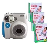 | The Fujifilm Instax Mini 7S Kit is a compact, ultra-hip, instant film camera that you'll want to take everywhere. Rounded lines, retro styling, and simple operation make this point-and-click great for parties, art projects, and anywhere you'd like to take instant photos. Like larger Instax cameras, the Mini 7S produces near-instant, vivid, high-quality prints. Unlike other models however, the Mini 7S uses Instax Mini film cartridges for pocket-friendly, credit card-sized images. Bring back the fun of instant photos! Give prints away or trade with friends. The Fujifilm Instax Mini 7S lets you shoot and share amazing pictures with ease. The kit Includes camera strap 4 AA batteries and 3 single packs of INSTAX MINI film enough for a 30 shots ...Read